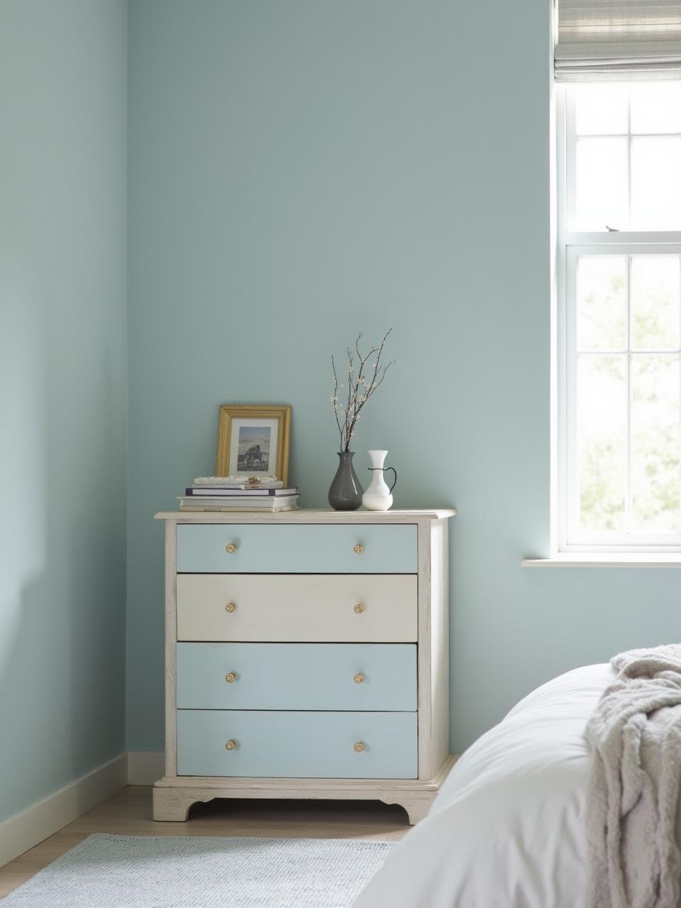 - Sur des meubles : un buffet ou une commode peints en bleu clair offrent une touche vintage et élégante