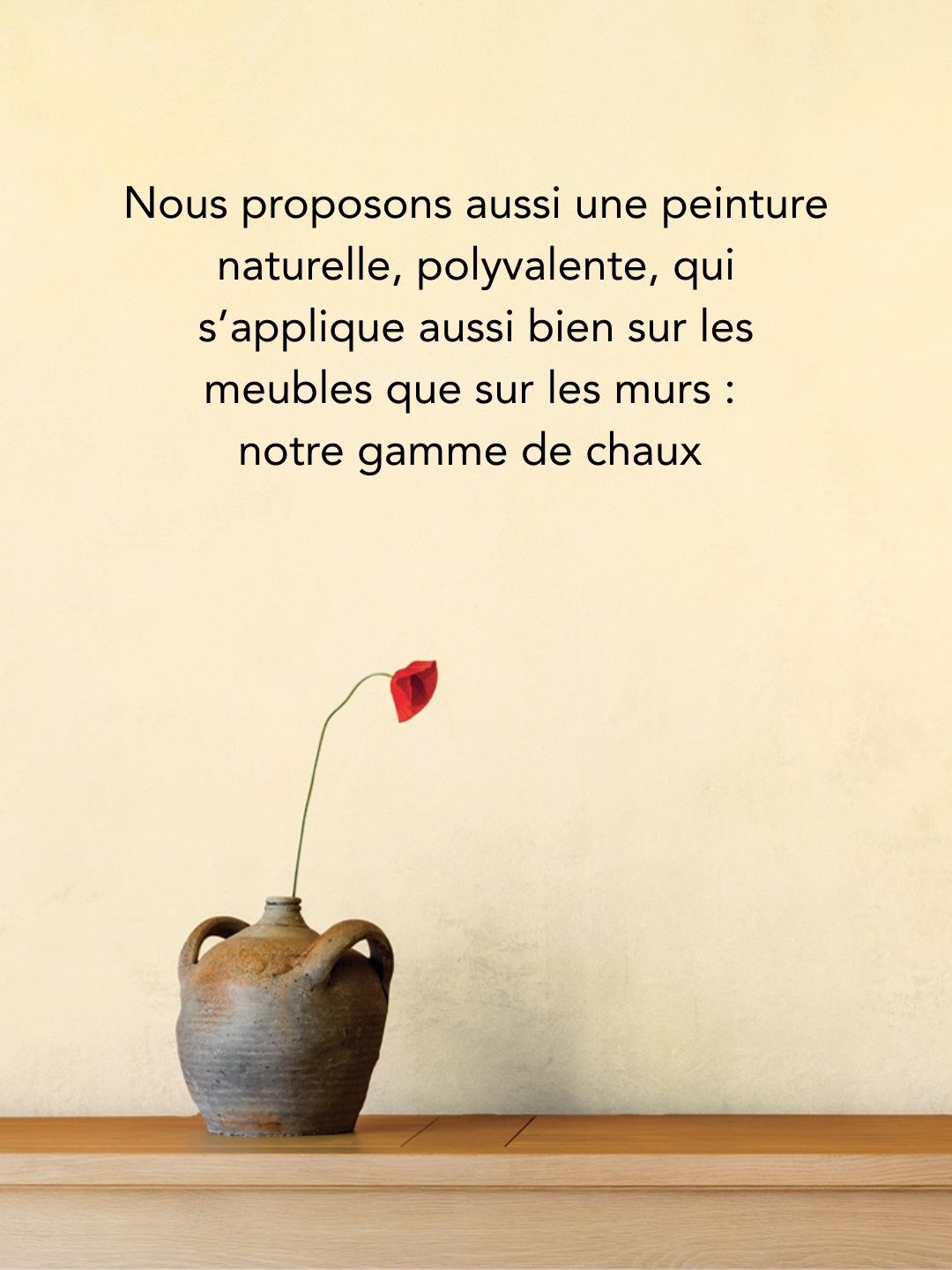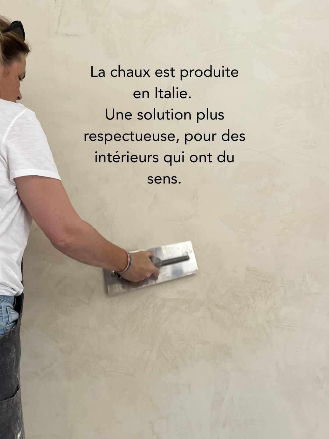 Et nous proposons aussi une peinture naturelle, polyvalente, qui s’applique aussi bien sur les meubles que sur les murs : notre gamme de chaux — idéale pour des finitions minérales élégantes — est quant à elle produite en Italie. Une solution plus respectueuse, pour des intérieurs qui ont du sens.