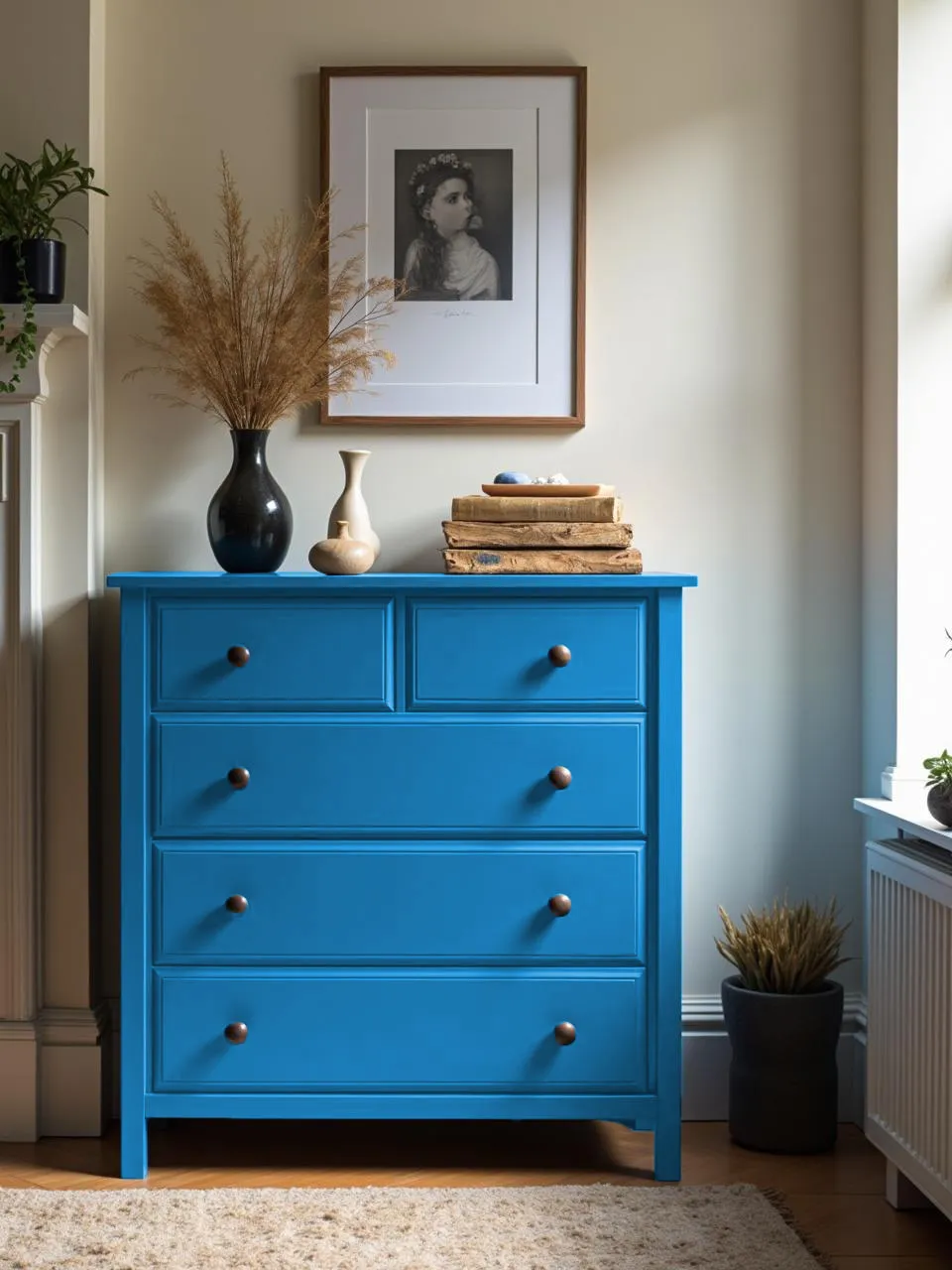 Profond et vibrant, Bleu Électrique est une teinte intense inspirée des monochromes d’Yves Klein. À la fois flamboyant et lumineux, il insuffle énergie et modernité dans n’importe quel espace. Utilisé en couleur principale sur les murs, il crée une atmosphère audacieuse et artistique ; par petites touches sur un meuble ou un objet, il devient un accent raffiné et contemporain. Associé au bois brut, il revisite l’esprit campagne chic en version moderne. Mixé à des matières précieuses comme l’or, il affirme une décoration singulière et luxueuse. Pour des contrastes plus doux, il s’harmonise parfaitement avec des tons neutres comme le blanc (Saule Blanc), le beige (Grège ou Fleur de Lin) ou encore des rosés subtils (Églantine ou Bouton de Rose).